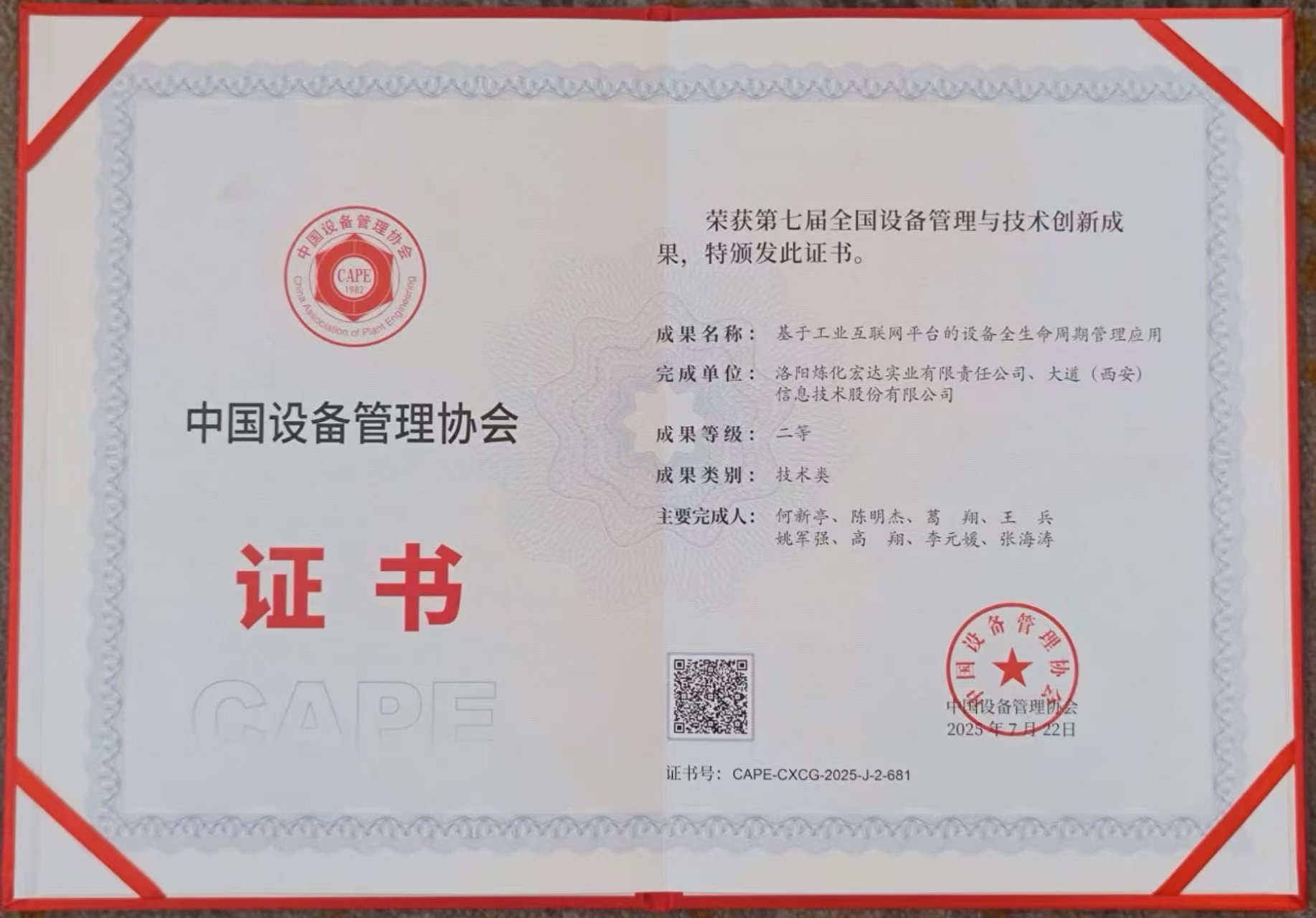 近日,中国设备管理协会公布第七届全国设备管理与技术创新成果名单,公司主导研发并成功建设的“基于工业互联网平台的设备全生命周期管理应用”系统,凭借其卓越的创新性、显著的实践效益和突出的行业引领价值,荣获技术类二等奖。这一荣誉不仅是对该系统创新设计与技术先进性的高度认可,也充分体现了公司在工业互联网平台设备管理领域的技术实力和持续创新能力。